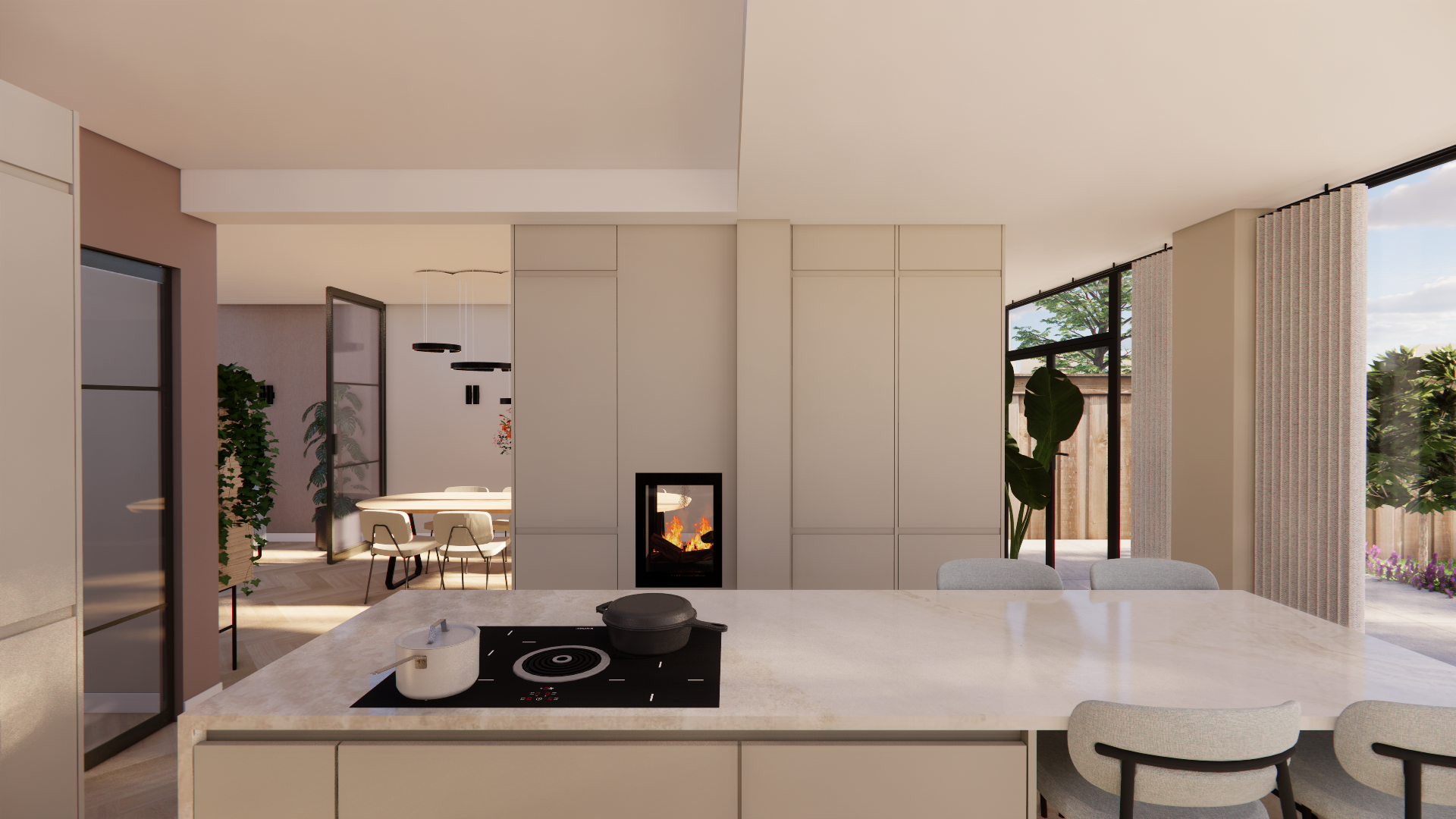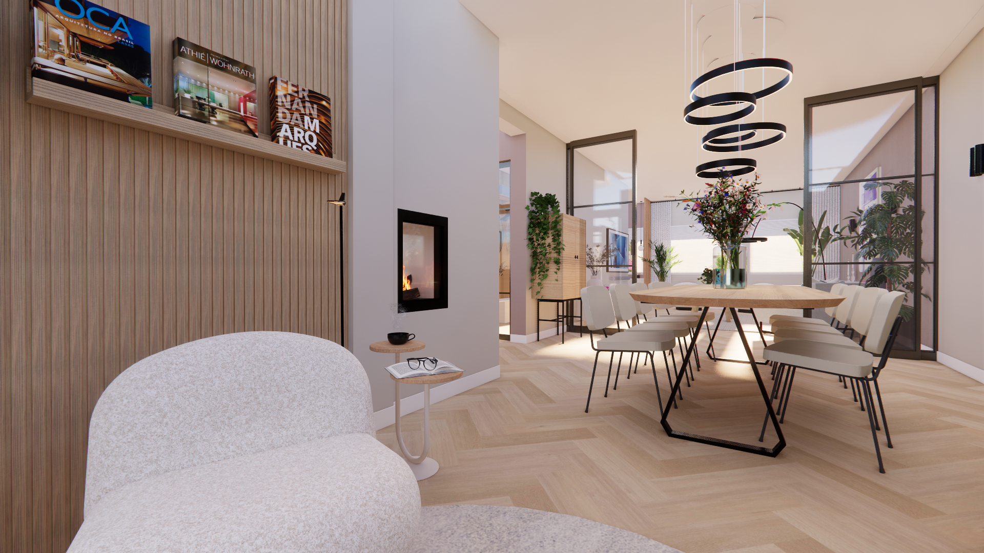 De sfeervolle haard voegt niet alleen warmte en gezelligheid toe, maar ook een visuele connectie tussen de verschillende leefruimtes.