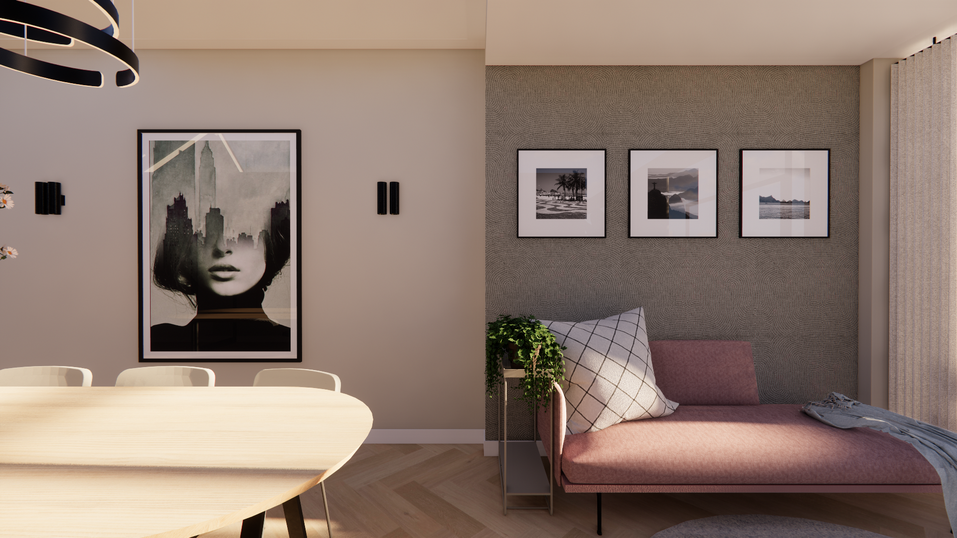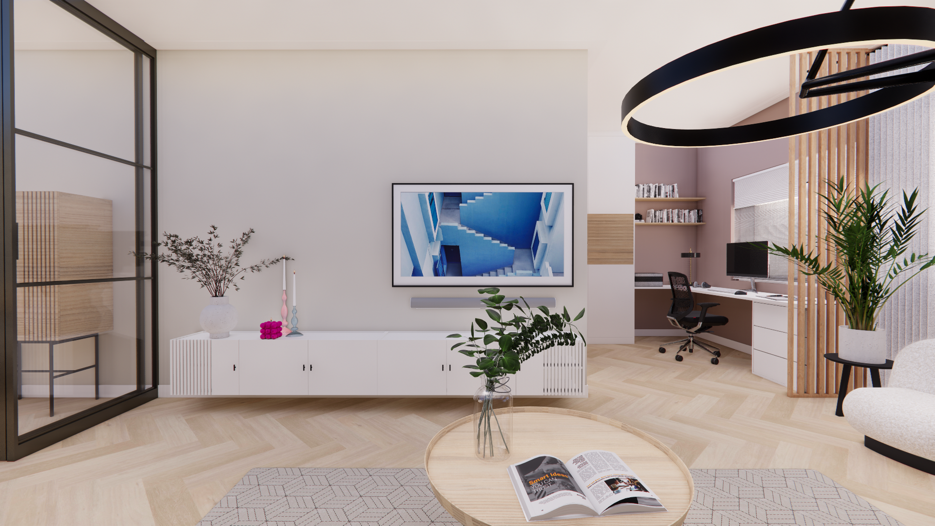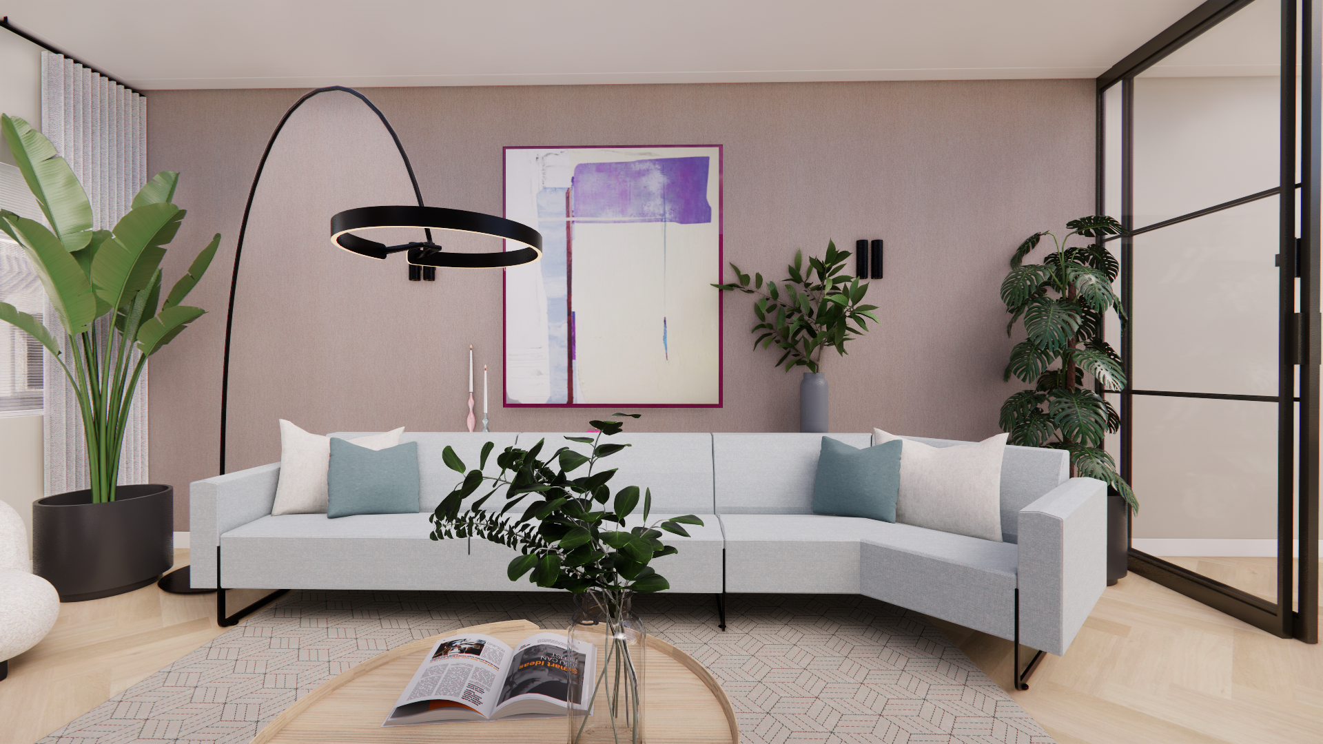 een gezellige woonkamer, waar natuurlijke elementen en een vleugje roze harmonieus samenkomen. Deze warme en uitnodigende ruimte biedt de perfecte plek om te ontspannen. Een opvallende blauwe bank vormt een mooie tegenhanger, waardoor de ruimte een speels karakter krijgt.