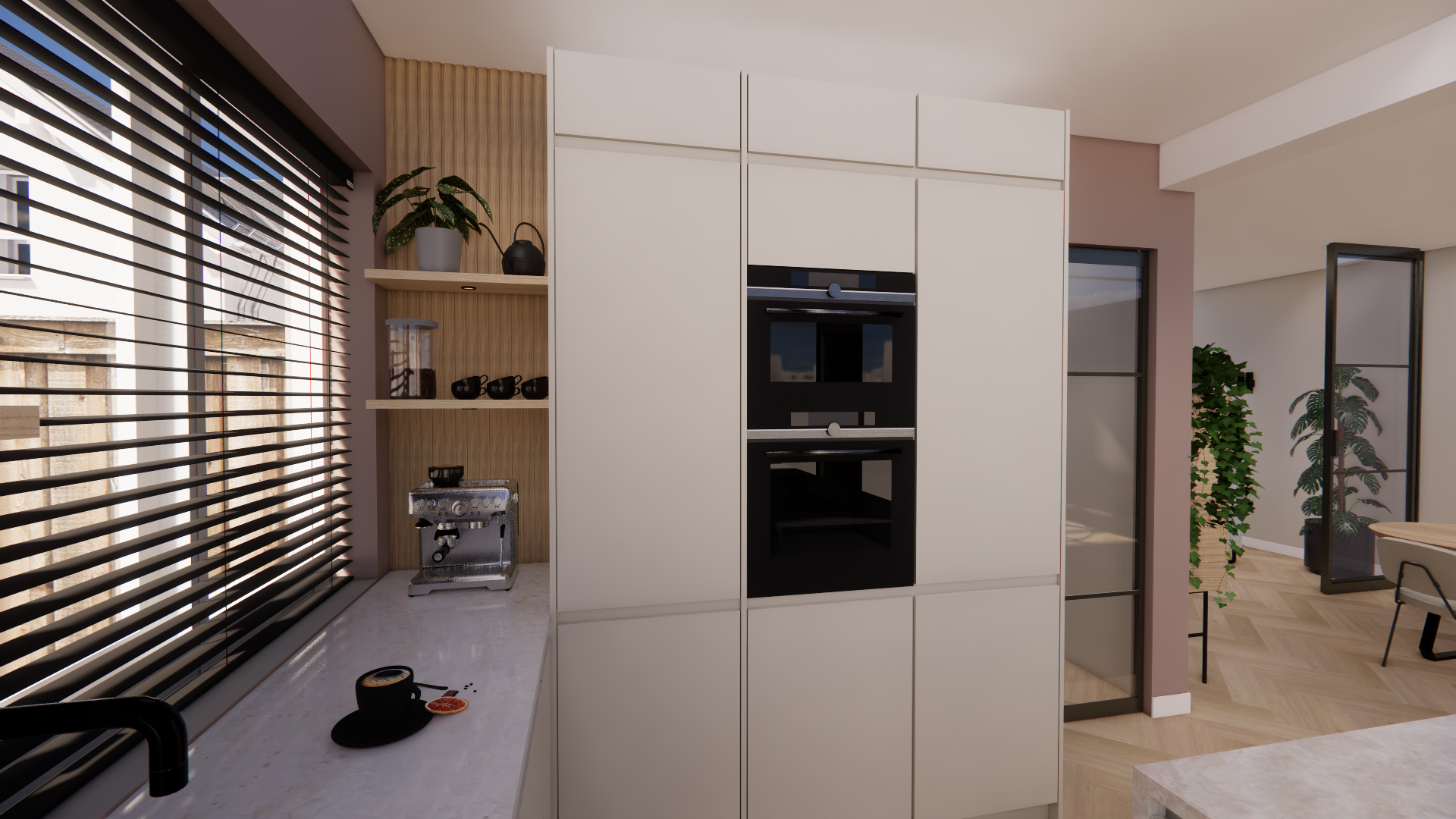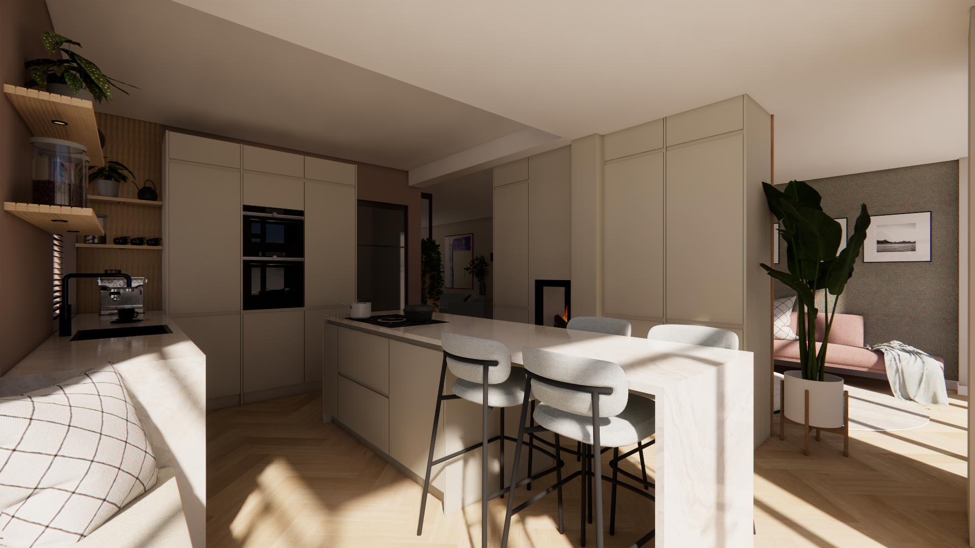 een keuken, gekenmerkt door een tijdloze neutraliteit en verfijnde houten accenten. Het kookeiland heeft een gezellige plek om met vier personen te ontbijten.