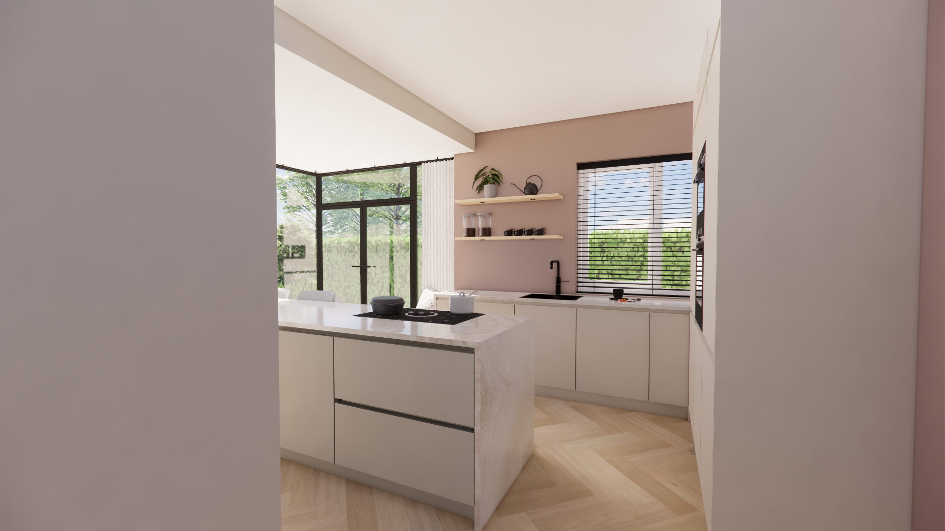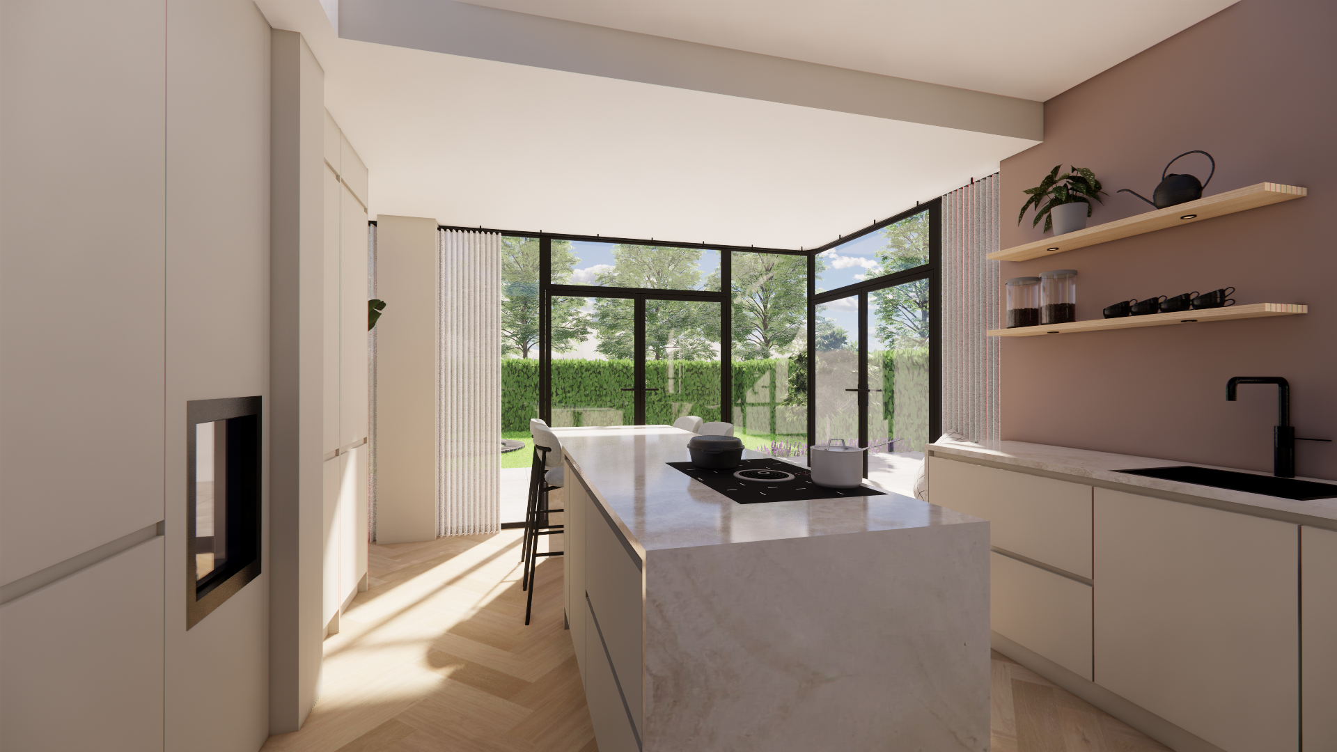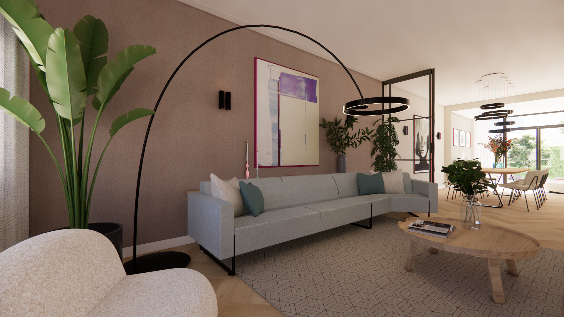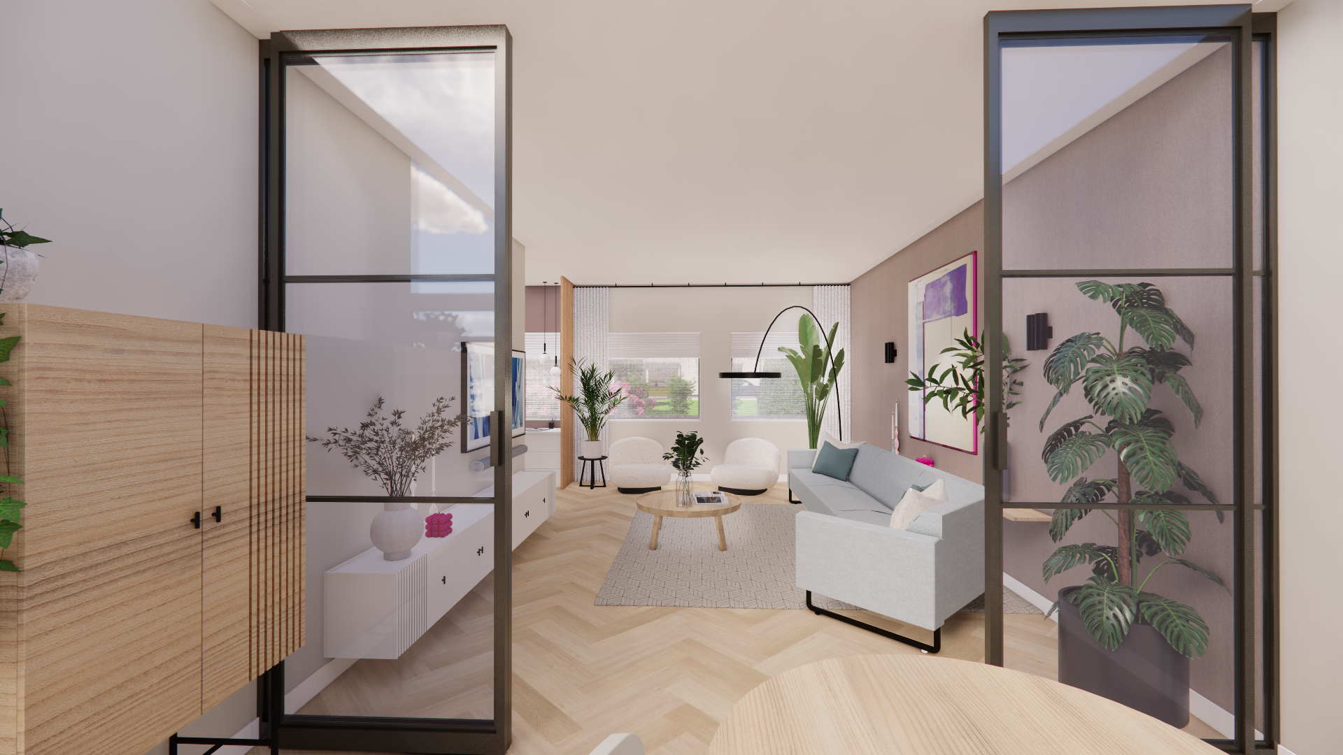 een eetkamer die naadloos verbonden is met zowel de woonkamer als de keuken. Hier vind je ook een zithoekje dat is ingericht om te genieten van ontspannen momenten, omringd door natuurlijk licht en een heerlijk zicht op de omgeving. Of je nu een boek wilt lezen terwijl je geniet van een kop koffie of 's avonds wilt ontspannen met een goed glas wijn, dit zitje biedt de ideale plek om tot rust te komen en te genieten.