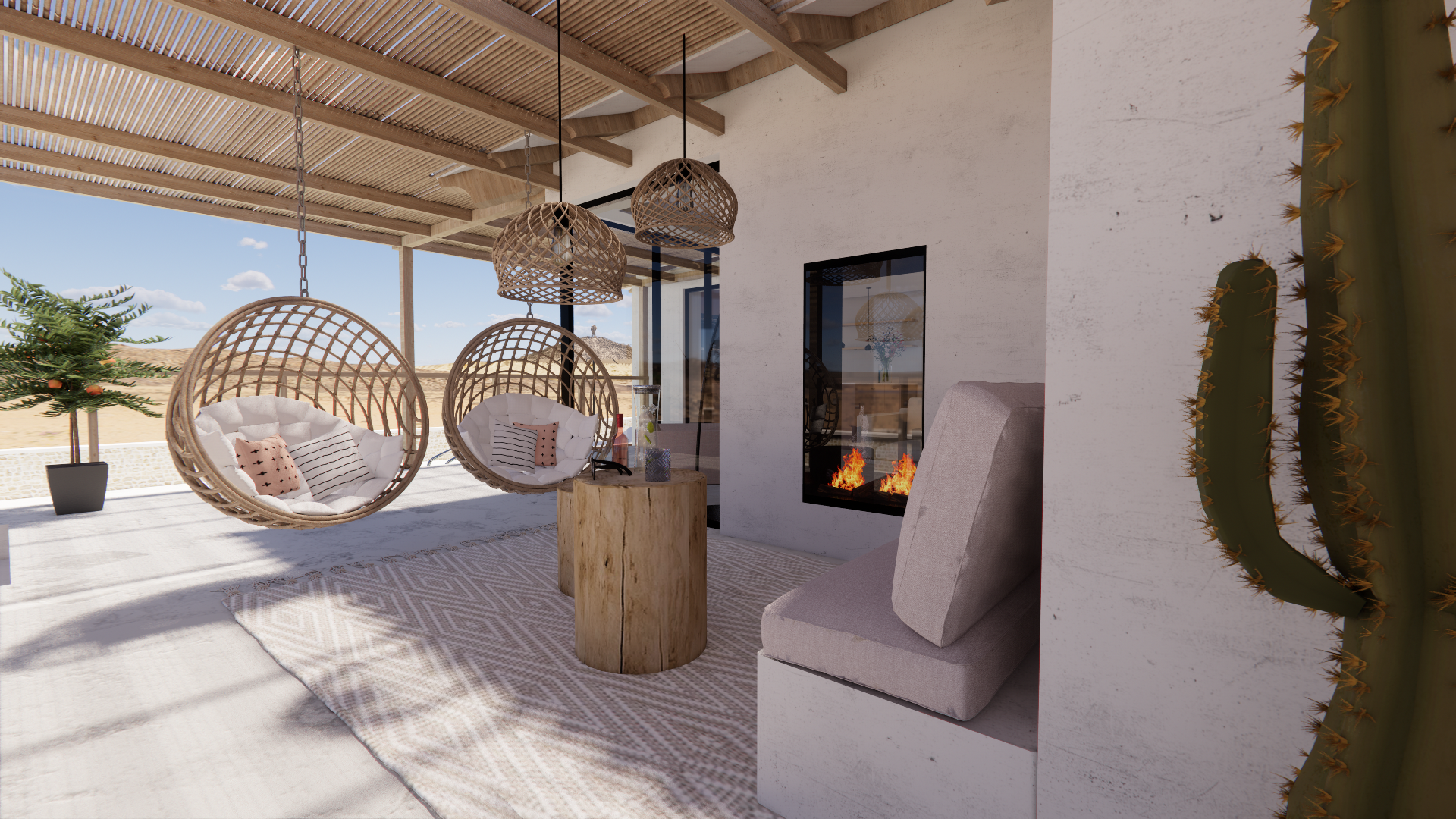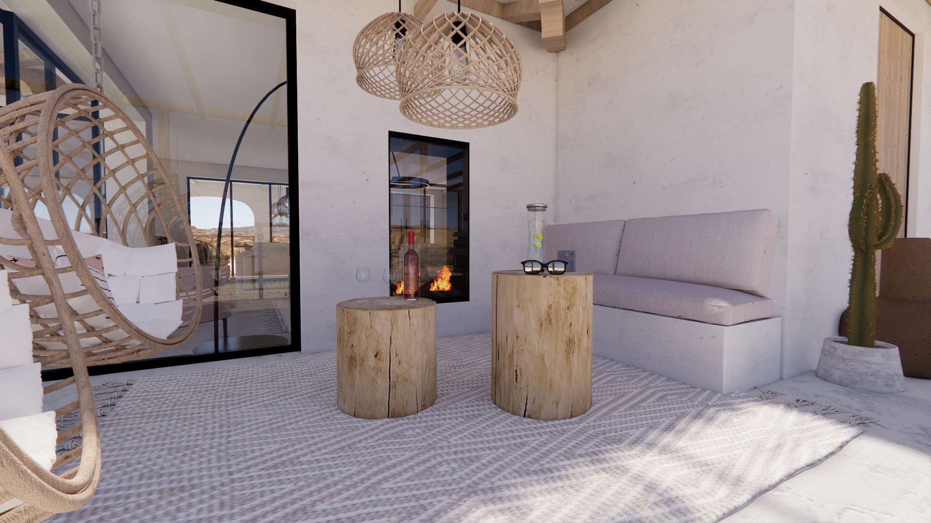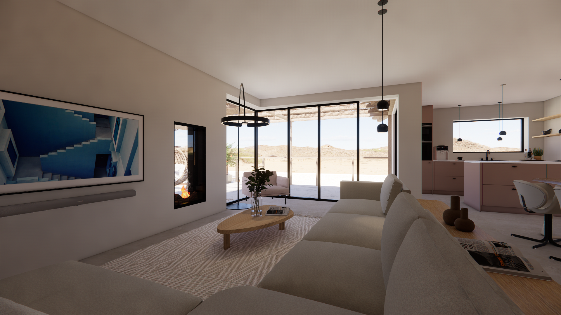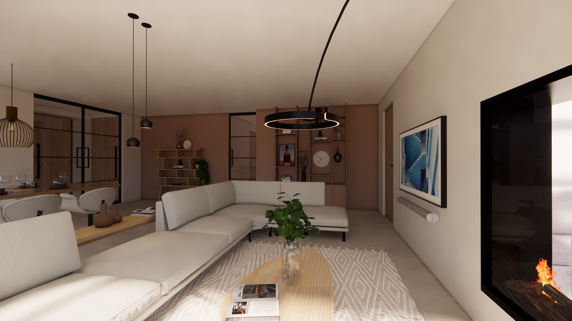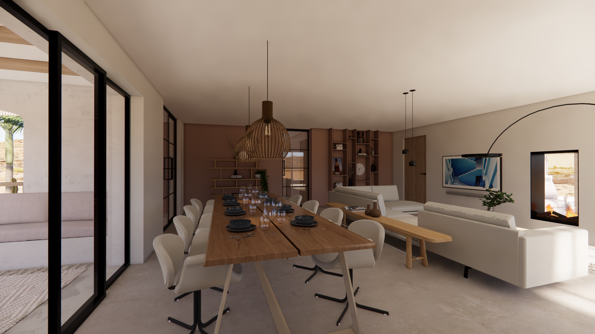 Een echte blikvanger is de binnen-buitenhaard, die het hele jaar door voor warmte en sfeer zorgt. Of je nu in de zomer buiten bij het zwembad zit of in de winter binnen knus bij de haard ontspant, deze feature voegt een vleugje luxe en gezelligheid toe aan de ruimte.