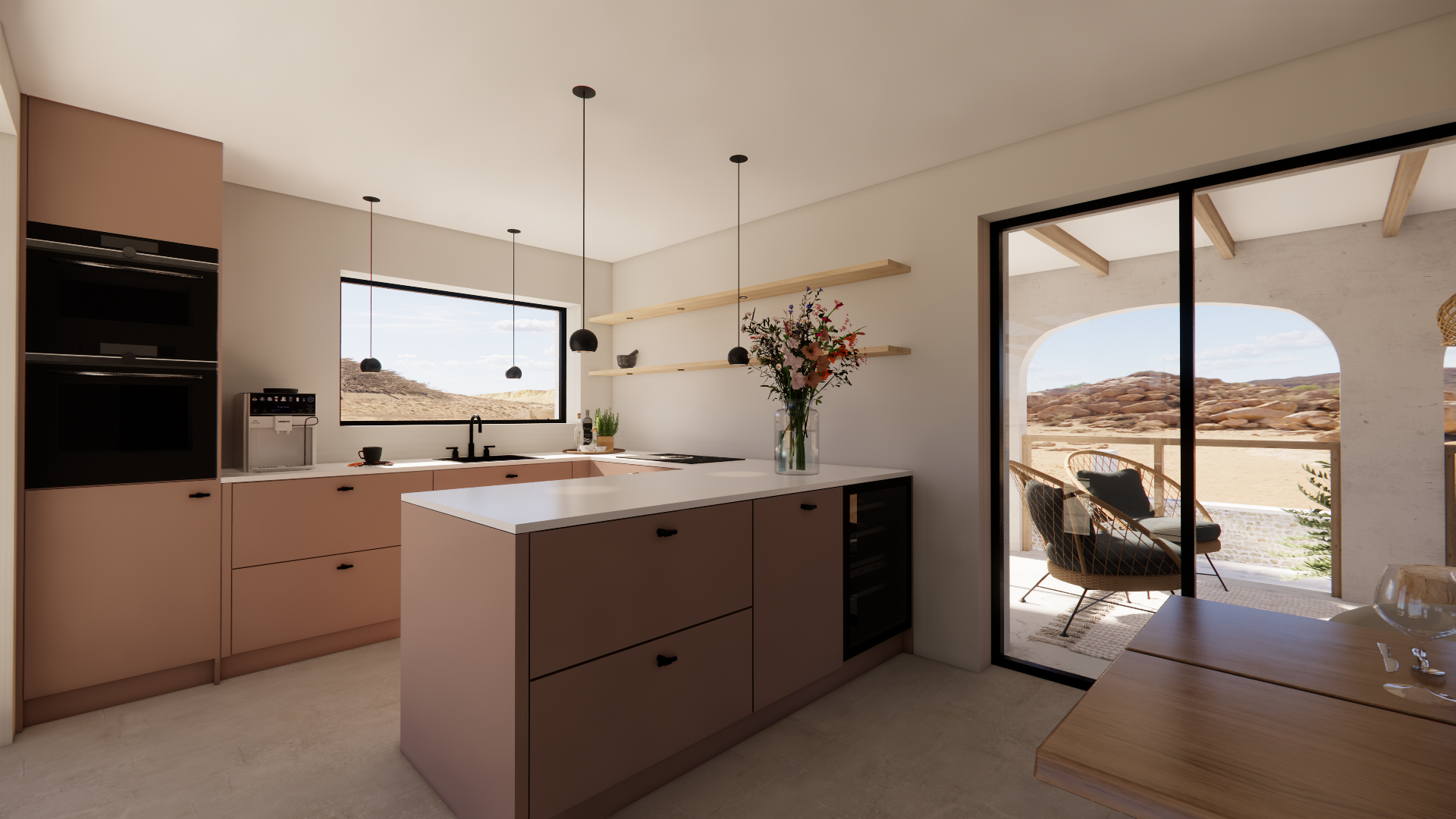 Binnen in de bungalow word je begroet door warme kleuren en een lichte houten inrichting die een gezellige en uitnodigende sfeer creëren. De grote glazen schuifdeuren zorgen voor een naadloze overgang tussen binnen en buiten